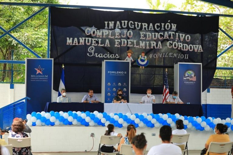 El Ministro de Hacienda, Alejandro Zelaya, el Director Ejecutivo de FOMILENIO II, William Pleites, la Ministra de Educación, Carla Hananía de Varela y el Director Residente de la Corporación Reto del Milenio, Preston Winter, participaron esta mañana en la inauguraron del Complejo Educativo Manuela Edelmira Córdova, en Usulután, construido gracias a una inversión de $1.85 millones con fondos de FOMILENIO II, aportados por el gobierno de los Estados Unidos a través de la Corporación Reto del Milenio (MCC).